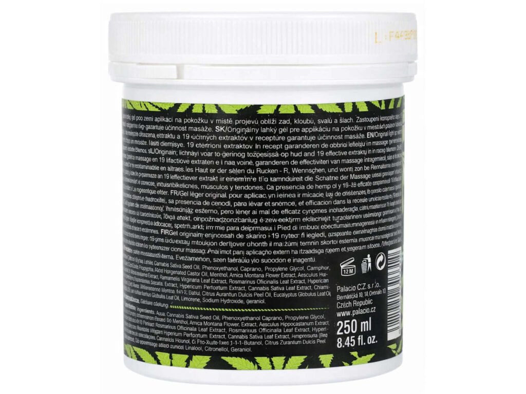 Základ tvoří konopný olej (Cannabis sativa seed oil), známý svými výživnými a zjemňujícími vlastnostmi pro pokožku. Gel dále obsahuje mentol, kafr, glycerin, borovicový olej a extrakty z 19 bylin, například arniku, měsíček, kaštan, kostival, třezalku, řebříček, heřmánek a jitrocel. Tato kombinace bylinných složek je oblíbená pro své revitalizační, prohřívací a osvěžující účinky při masáži. Produkt obsahuje více než 94 % složek přírodního původu a je dermatologicky testován.
