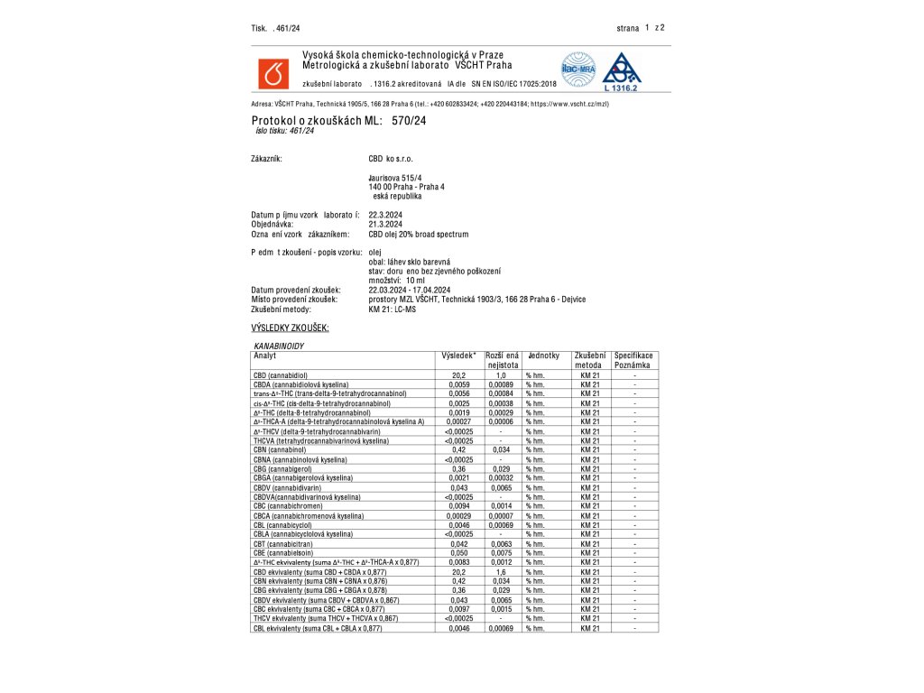 Nerafinovaný konopný olej, CBD 20%, ostatní kanabinoidy, flavonoidy a terpeny ve stopovém množství